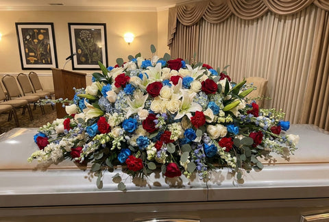 #15 Patriotic Honor Casket Spray – Red Roses, Blue Hydrangea & White Orchids