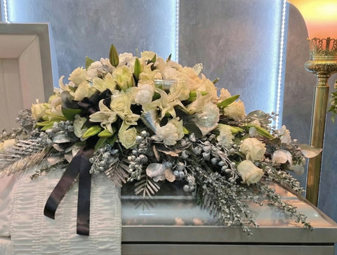 #242 Elegant White Casket Spray – Roses, Calla Lilies & Orchids | Colorado Funeral Flowers